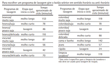O tempo aproximado do ciclo não considera o tempo de enchimento, de drenagem e se as funções enxágue duplo ou mais secas estão ativadas.