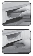 Limpe o Dispenser Flex regularmente para que sua eficiência seja mantida. 1. Abra o Dispenser Flex, retire o compartimento para sabão l í q u i d o e pressione a trava localizada no fundo do compartimento para sabão em pó. Siga o sentido da seta da figura ao lado. Puxe o dispenser para retirar. 2. Remova os sifões dos c o m p a r t i - mentos de s a b ã o l í - quido e de amaciante puxando-os para cima. 3. Lave os sifões, a gaveta (compartimento de sabão em pó e amaciante) e o compartimento de sabão líquido em água corrente e com uma esponja macia. Depois recoloque os sifões no compartimento de sabão líquido e amaciante. Os sifões de amaciante e sabão líquido são diferentes. Certifique-se de recolocá-los no compartimento correto. A troca dos sifões (exemplo: encaixar o sifão de sabão líquido no compartimento de amaciante) pode prejudicar o funcionamento da Lavadora.