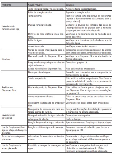 IMPORTANTE Quando a função reutilizar água está ativada a Lavadora fará uma pausa. Enquanto a função reutilizar água ou a função avançar etapa não for pressionada novamente, para escoar a água com sabão, o ciclo não irá continuar. Assim, o tempo do ciclo irá depender do tempo em que a Lavadora ficou em pausa até você reutilizar a água.