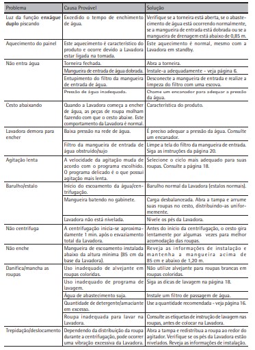 B. Programas Os programas de lavagem oferecem um cuidado especial para as diferentes cores de roupa e sujeiras. Além dos ciclos especiais que são específicos para lavar artigos de cama e banho, jeans e o programa rápido para roupas pouco sujas somente com odores. O programa de limpeza lavadora foi desenvolvido para garantir um cuidado especial na manutenção de sua Lavadora. C. Alerta para limpeza lavadora Um alerta irá acender no painel sempre que sua Lavadora necessitar de uma limpeza especial. Siga as instruções de uso do Programa limpeza lavadora na página 19 do manual ou na parte interna da tampa de vidro.