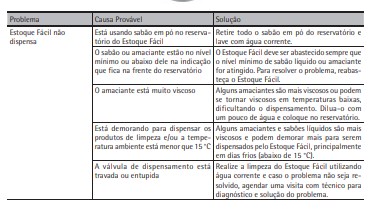 IMPORTANTE Alguns amaciantes e sabões líquidos são mais viscosos e podem demorar mais para serem dispensados pelo Estoque Fácil, principalmente em dias frios (abaixo de 15 °C). Para utilizar sabão em pó e amaciante não concentrado, coloque os produtos diretamente na gaveta do Dispenser Flex, sem utilizar o Estoque Fácil.