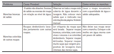Para conservar melhor as roupas é necessário saber como lavá-las. Aprenda como tirar o melhor proveito de sua Lavadora e preserve suas roupas por mais tempo. Verifique na etiqueta: • se a roupa é lavável em água (alguns artigos de lã, por exemplo, não são); • se pode ser lavada em máquina; • se pode ser lavada com alvejantes. • Escolha os produtos e tipos de lavagem adequados para cada tipo de roupa. Separe as roupas • roupas brancas, das coloridas; • roupas coloridas de cores firmes, das coloridas desbotáveis; • roupas muito sujas (que exigem programas de lavagem mais intensos), das roupas pouco sujas. Assim você melhora o desempenho de cada programa, evitando danificar as roupas delicadas e pouco sujas; • artigos “receptores ” de fiapos (meias, maiôs etc), dos artigos “doadores” de fiapos (fraldas, moleton, toalha de banho etc). Examine as roupas antes da lavagem Antes de colocar as roupas na Lavadora, verifique e retire todos os objetos que possam se soltar durante a lavagem, danificando a Lavadora e impedindo o seu funcionamento. • Retire alfinetes, cintos, enchimentos ou quaisquer acessórios das roupas. Esses objetos podem danificar a Lavadora ou gerar ruídos durante a lavagem; • retire o que estiver dentro dos bolsos (alfinetes, moedas, pregos, clipes etc); • retire os ganchos ou rodízios das cortinas antes da lavagem; • roupas rasgadas ou descosturadas devem ser consertadas antes de lavar, bem como botões e acessórios que não estejam totalmente fixados à roupa; • feche zíperes e botões de pressão, para que não se estraguem ou se prendam em outras peças de roupa.