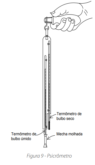A umidade relativa do ar pode ser medida com auxílio de higrômetros, sendo que os técnicos de ar condicionado (A/C) usam mais comumente os psicrômetros (Figura 9). Estes consistem basicamente de dois termômetros, um de bulbo seco e outro úmido. Com estas medidas, a umidade pode ser lida numa Carta Psicrométrica.