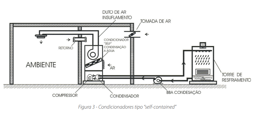 Instalações até 100 TR (este número limite pode variar). A instalação pode consistir no uso de um ou mais de um condicionador unitário tipo “janela” (Figura 1), condicionadores tipo “split” (Figura 2), ou num sistema um pouco mais complexo constituído de condicionadores tipo “self-contained” (auto-portante), rede de dutos para distribuição do ar, torre de resfriamento, bomba de água de condensação e respectivas tubulações (Figura 3).
