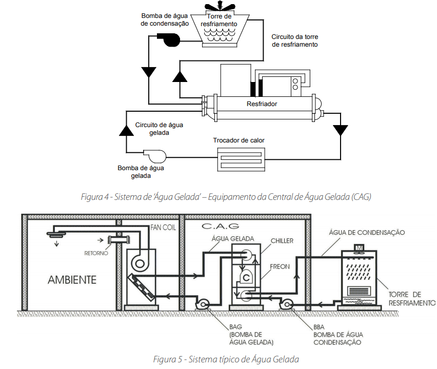 É assim dito, quando a água é distribuída para os recintos, onde passa nos condicionadores de ar. Estes condicionadores são chamados de “Fan coil” (ventilador serpentina).