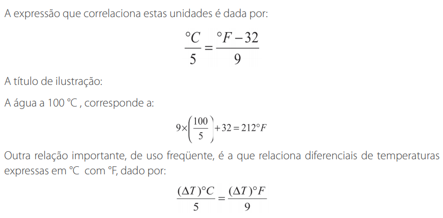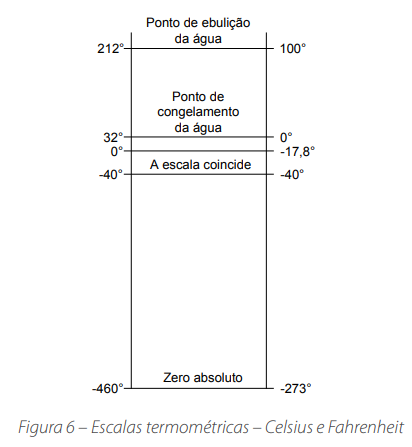 A temperatura é uma propriedade da matéria. É uma medida do nível energético de um corpo. Uma alta temperatura é um indicativo de alto nível de energia do corpo. Diz-se, neste caso, que o corpo está quente. Já se demonstrou que a temperatura é uma função da energia cinética interna, sendo um índice da velocidade molecular. É expressa em graus Celsius (°C), no sistema Internacional, Fahrenheit (°F) e outras unidades. A correspondência entre as escalas Celsius e Fahrenheit, é mostrada na Figura 6, a seguir: