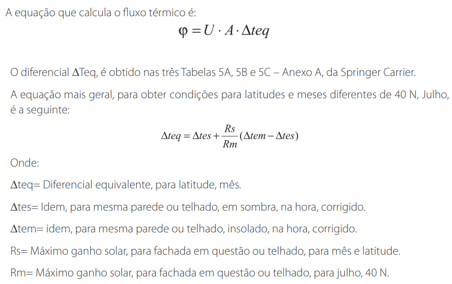 O ganho por Condução é influenciado pelo diferencial de temperaturas através da parede ou telhado, seu Coeficiente de Transmissão Global de Calor (“U”) e da área da superfície. A localização da cidade da edificação influencia nas temperaturas externas ambientes, acarretando maiores ou menores cargas por Condução, através de paredes ou outros elementos externos da construção. Considerando que a temperatura externa varia ao longo do ano e do dia, a carga térmica por Condução, através das paredes externas e telhados, não é calculada diretamente usando uma temperatura fixa de projeto. Numa metodologia utilizada (da Springer Carrier), foram desenvolvidos cálculos de “temperatura equivalente” que consideram o regime transiente, do transporte através das paredes/telhados, que podem ser usados nos cálculos em questão, com as devidas correções, para o correto diferencial de temperatura (externa/interna), fachada, latitude, mês, cor de parede e “daily range”