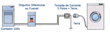 Instalar uma tomada de corrente próximo da máquina de lavar. A sua cablagem de alimentação deve ser ligada diretamente ao contador de eletricidade. Esta linha deve obrigatoriamente ser alimentada por um cabo com 3 condutores (2 cabos de corrente + 1 cabo de terra).