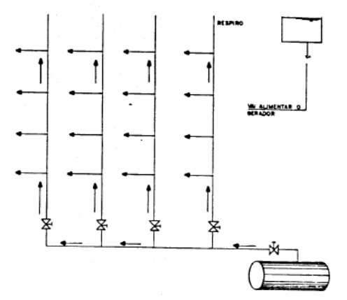 A distribuição neste sistema pode ser ascendente, descendente ou mista. Na distribuição ascendente (Figura 1.3),tem-se um barrilete inferior que alimenta as colunas.Na distribuição descendente (Figura 1.4),as colunas são alimentadas por um barrilete superior.Na distribuição mista (Figura 1.5),existem dois barriletes,um superior e outro inferior.