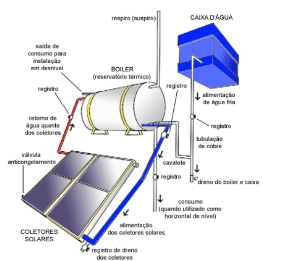 Circulação Natural ou Termossifão:é a forma de instalação mais utilizada em residências. A circulação da água acontece apenas pela diferença de densidade da água quente em relação à água fria. A água quente naturalmente menos densa tende a “subir” formando assim um circuito de circulação de água entre o boiler e as placas coletoras sem a necessidade de bombeamento.