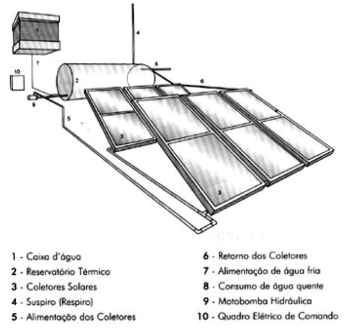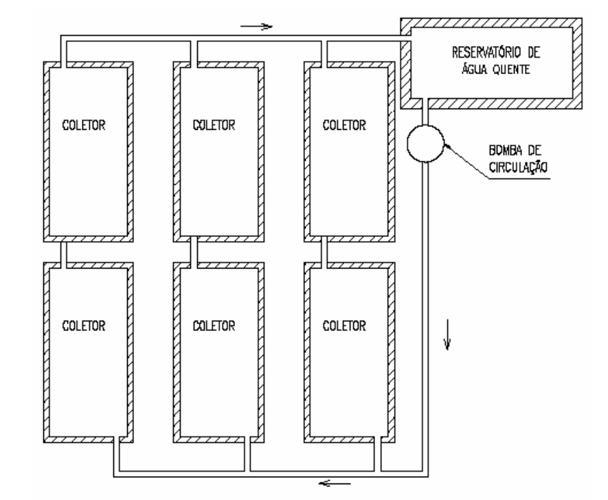 Este tipo de instalação é geralmente utilizado em instalações de grande porte ou quando os desníveis e distâncias necessárias entre coletores solares e boiler não puderem ser respeitados. Neste caso, o conjunto de placas poderá ficar até mesmo acima do reservatório de água fria. Uma motobomba fará com que a circulação da água se proceda normalmente. Juntamente com a motobomba, será necessária a instalação de um termostato diferencial de temperatura, o qual tem por função ligar e desligar a motobomba sempre que a temperatura do coletor solar estiver mais aquecida que a temperatura da água no interior do boiler.