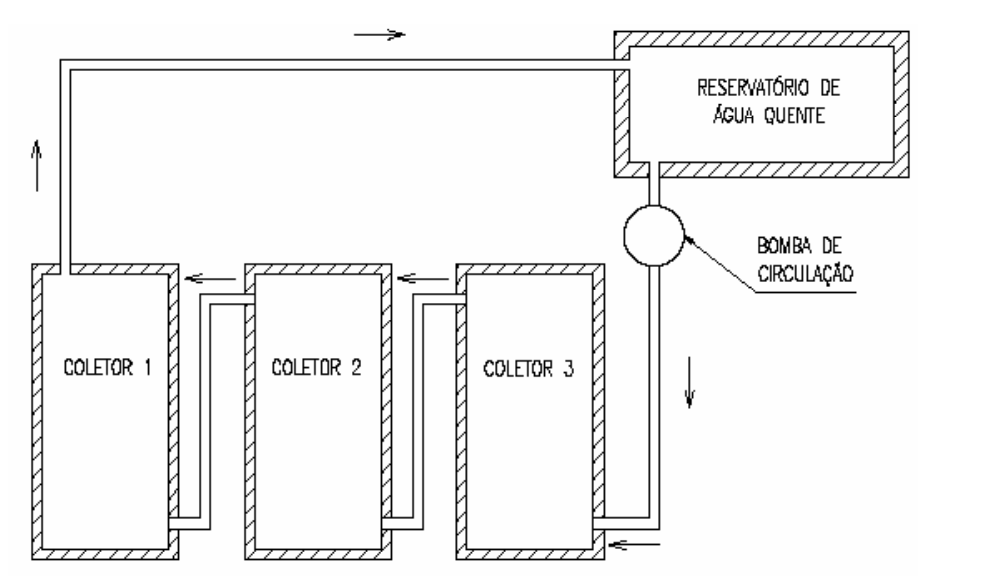 É uma combinação da ligações anteriores e a circulação deve ser forçada. Utiliza-se esta modalidade quando se deseja aumentar quanto o volume quanto a temperatura da água. A Figura 1.15 apresenta o esquema típico de instalação deste tipo de ligação.