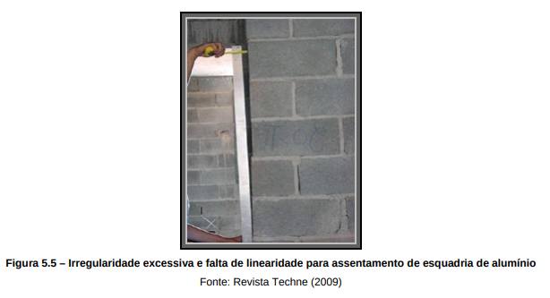 Dentre os diferentes métodos de instalação de esquadrias de alumínio, sem a utilização do contramarco, é sem dúvida o mais simples e o que menos garante a qualidade a estanqueidade no sentido mais específico da isolação a água, que é a desvantagem no produto final desse sistema de instalação quando executado sem as técnicas adequadas, conforme figura 5.5. A vedação nesse caso é garantida pelo perfeito requadramento do vão de modo a não ficar frestas depois da instalação do marco. Para que ocorra o perfeito requadramento do vão é necessário a utilização de um gabarito feito de um material metálico que garanta a rigidez necessária para a utilização contínua da peça. A utilização de um bloco de qualidade, com características dimensionais criteriosas, é fundamental para se garantir a perfeita medida do vão, conforme Engenheiro Fulvio Berçot Miranda (2009).