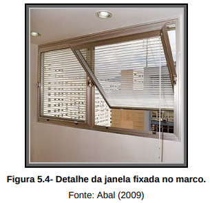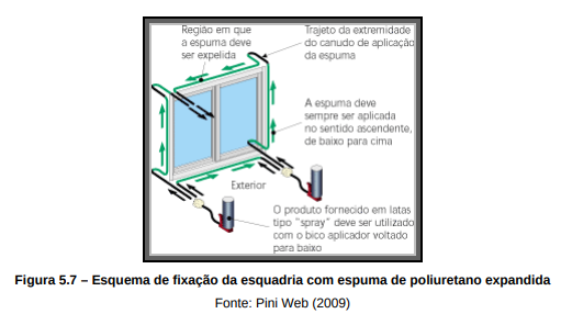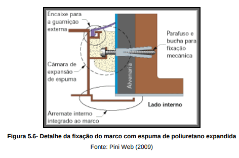 Para a fixação da esquadria no vão, ao contrario da utilização da argamassa de cimento e areia no chumbamento do contramarco. Nesse caso utiliza-se um sistema de fixação mecânica com bucha e parafuso, fazendo a vedação com espuma de poliuretano expansível, conforme as figuras 5.6 e 5.7.