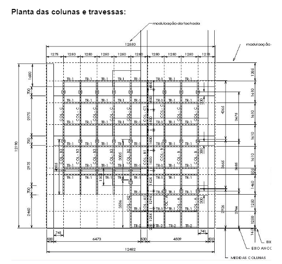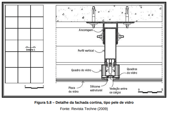 A medição da fachada é feita em projeto de arquitetura e conferida no local, para se garantir a exatidão na produção dos componentes que formam o conjunto do revestimento. Com essas medidas é feito o projeto da fachada com suas medidas, modulação dos vãos, eixos de fachada e ancoragem, conforme o Anexo D, para fixação das colunas e travessas que servem de apoio para fixação dos quadros onde os vidros estão colados.
