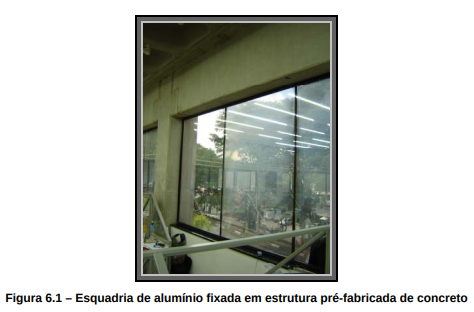 Quando se executa o serviço de esquadrias de alumínio em estruturas pré-fabricadas de concreto, deve-se tomar as devidas precauções de vedação da estrutura em suas juntas para que não ocorra percolação de água e assim possa afetar o conjunto da esquadria, conforme Figura 6.2 e Figura 6.3.