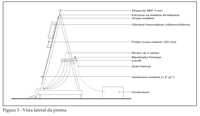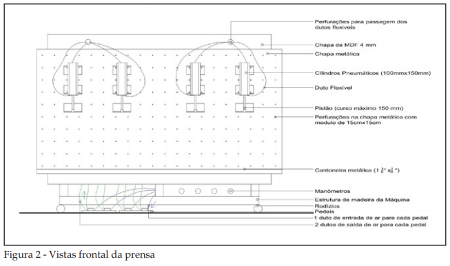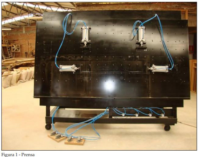 A máquina foi desenvolvida na marcenaria Fachinetto LTDA., localizada em Vespasiano Corrêa - RS, em agosto de 2010, visando a qualificar e agilizar o processo de produção da empresa. A Figura 1 mostra o aspecto frontal da prensa desenvolvida.