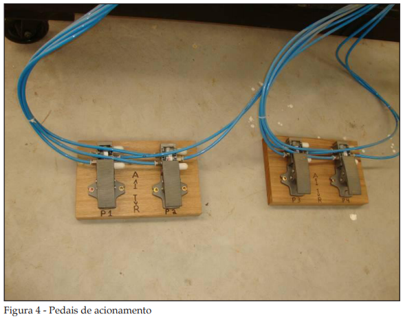 IV - os pedais (Figura 4) são responsáveis pelo acionamento dos cilindros pneumáticos, sendo cada cilindro acionado por um pedal. Esse pedal possui uma entrada e duas saídas de ar. Dependendo do posicionamento do pedal teremos a abertura, fechamento ou a carga mantida do pistão, pois as entradas e saídas de ar alimentam o pistão em extremidades opostas, superior e posterior. Logo, se direcionarmos o ar para a parte superior, o pistão descerá.