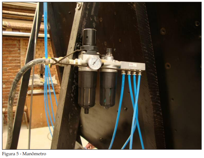 Todo o sistema é alimentado por um compressor com as seguintes características: 25/250 litros - 5 HP5 - 175 lbf / pol2-6 (volume, potência e pressão, respectivamente). A pressão gerada pelo compressor é canalizada até a prensa por um duto flexível de 5/15 pol /300 psi7 . Ao chegar, o ar passa por um manômetro com filtro de água e lubrifil (Figura 5) e então é distribuído por tubos flexíveis de bitola 8 mm x 1,25 mm / 10 Bar. O lubrifil é o componente responsável pela lubrificação do sistema. Manômetros são dispositivos medidores de pressão.