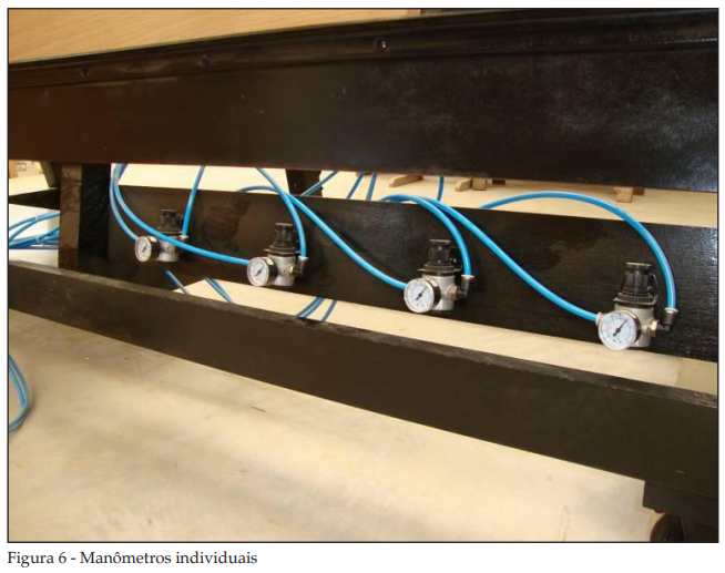 Após passar pelo primeiro manômetro, o ar passa por um divisor que o separa em quatro saídas. Cada saída alimenta um manômetro individual (FIGURA 6), que será responsável pela regulagem da pressão individual que alimentará cada pistão, determinando sua força.
