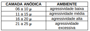 Tipo de acabamento superficial dos perfis que consiste em, através da eletrólise, depositar uma camada anódica de alumina na superfície dos perfis, protegendo-os contra os ataques químicos, e proporcionando maior brilho. A espessura da camada de anodização depende do ambiente de exposição conforme classificação a seguir: