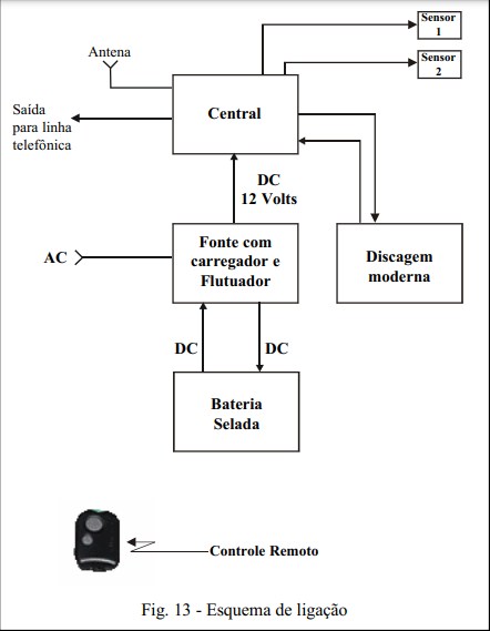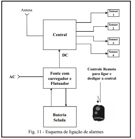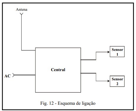 A figura anterior mostra uma central com quatro entradas para sensores com bateria, fonte carregador e flutuador, comandada via controle remoto. (Para muitos, independente do número de sensores, esta configuração é a mínima necessária.)