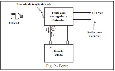 i = quando acaba a tensão da rede, a bateria fornece alimentação para a central de alarme através dos circuitos do carregador/flutuador.